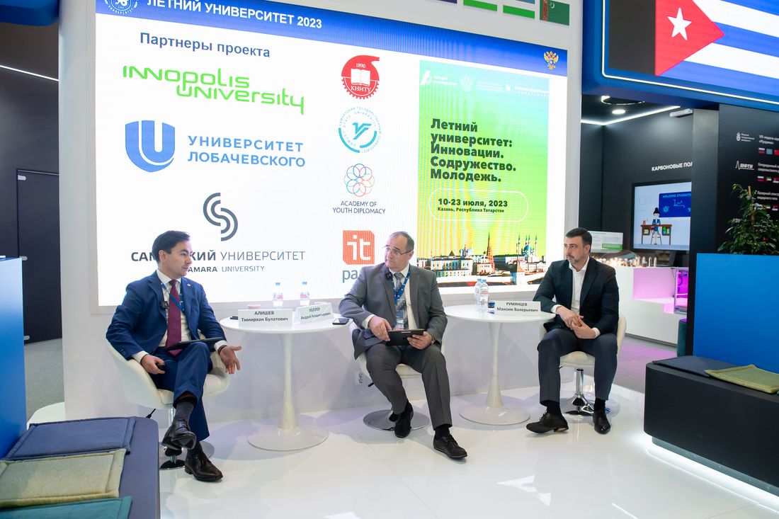 8 июня в рамках выставки «Евразия — наш дом» состоялась панельная дискуссия «Летний университет как площадка для знакомства иностранной молодежи с потенциалом российского образования». В ней приняли участие проректор Казанского федерального университета Тимирхан Алишев, ректор Уральского федерального университета Виктор Кокшаров и ректор Сибирского федерального университета Максим Румянцев.