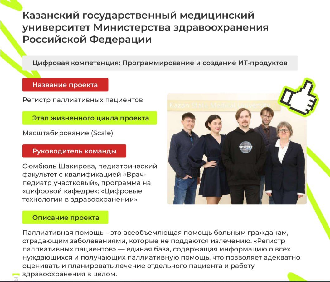 Студенты Казанского ГМУ разработали регистр паллиативных пациентов. Проект, выполненный под руководством студентки 6-го курса педиатрического факультета Сюмбюль Шакировой, призван уменьшить количество больных, не получающих паллиативную помощь. Его внесли в состав сборника лучших практик Университета Иннополис.