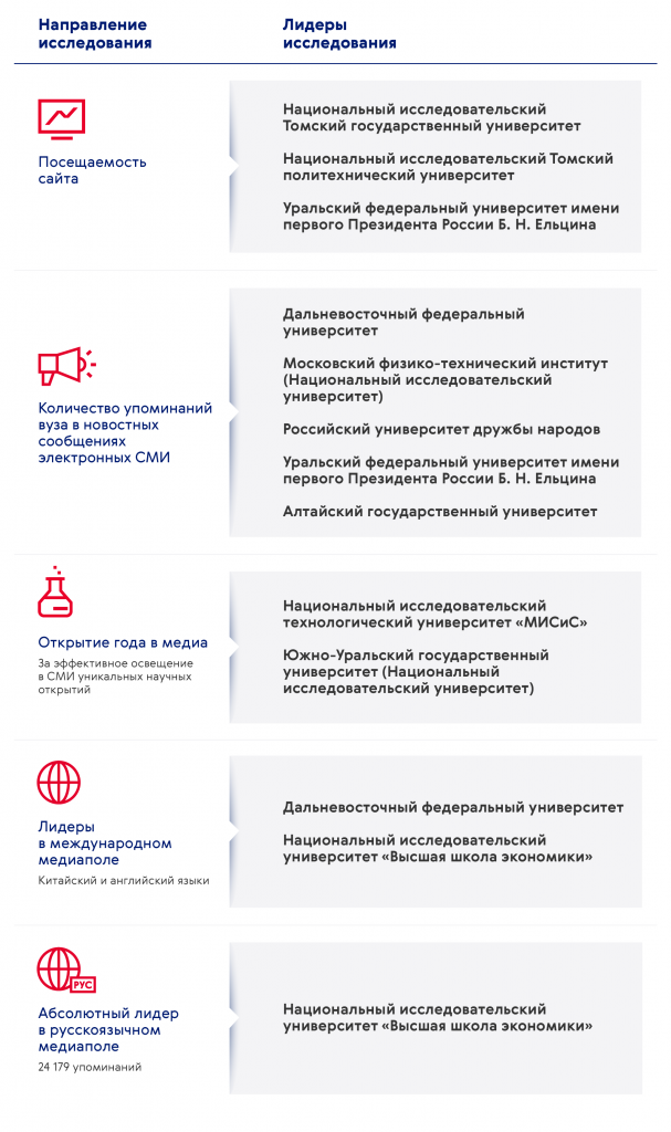 МИА «Россия сегодня» опубликовало итоги исследования медиаактивности 54 российских вузов в 2021 году, ранее участвовавших в академических программах развития. Все лидирующие позиции заняли участники программы Министерства науки и высшего образования Российской Федерации – «Приоритет 2030». Аналогичные результаты демонстрирует рейтинг медийной активности вузов M-RATE, разработанный Министерством для оценки результатов вклада университетов в популяризацию российской науки и высшего образования.